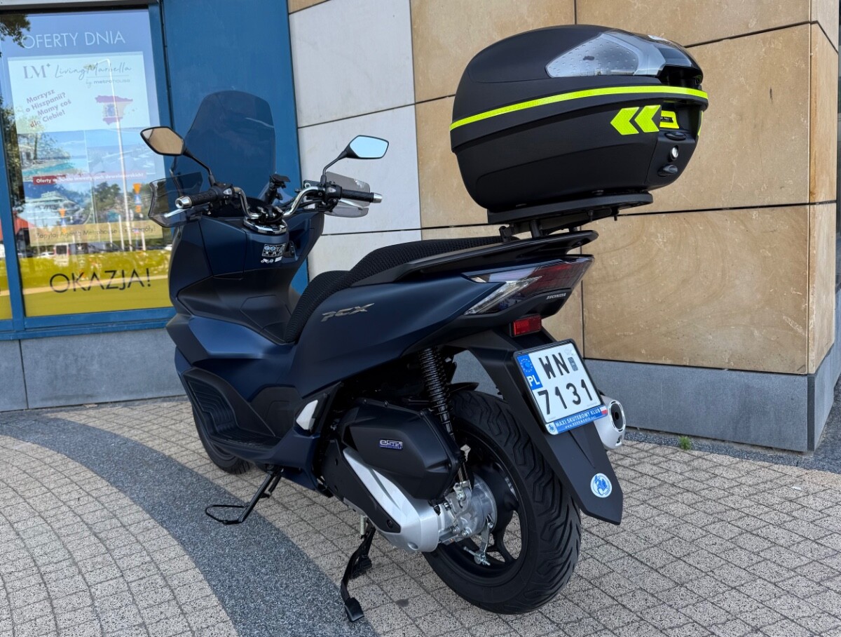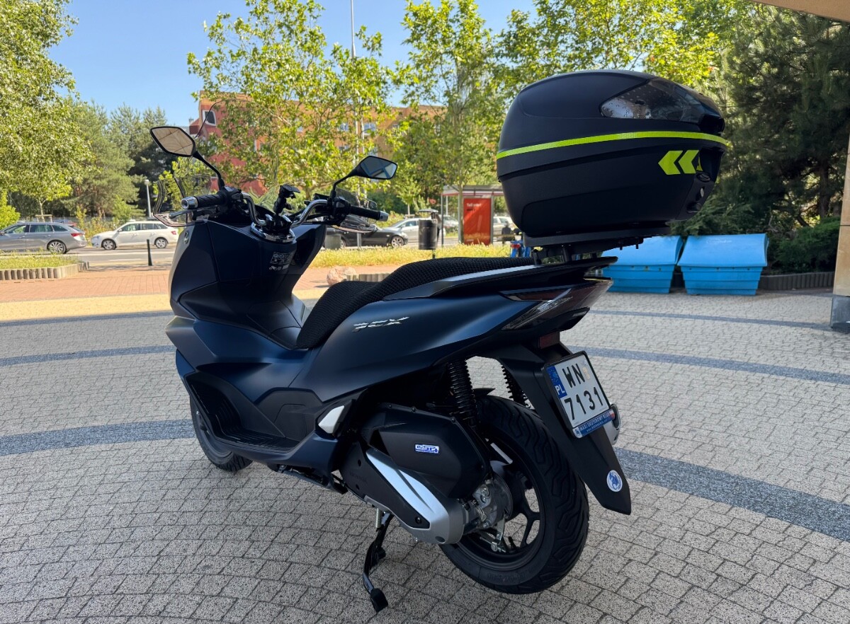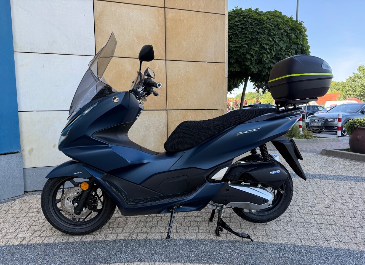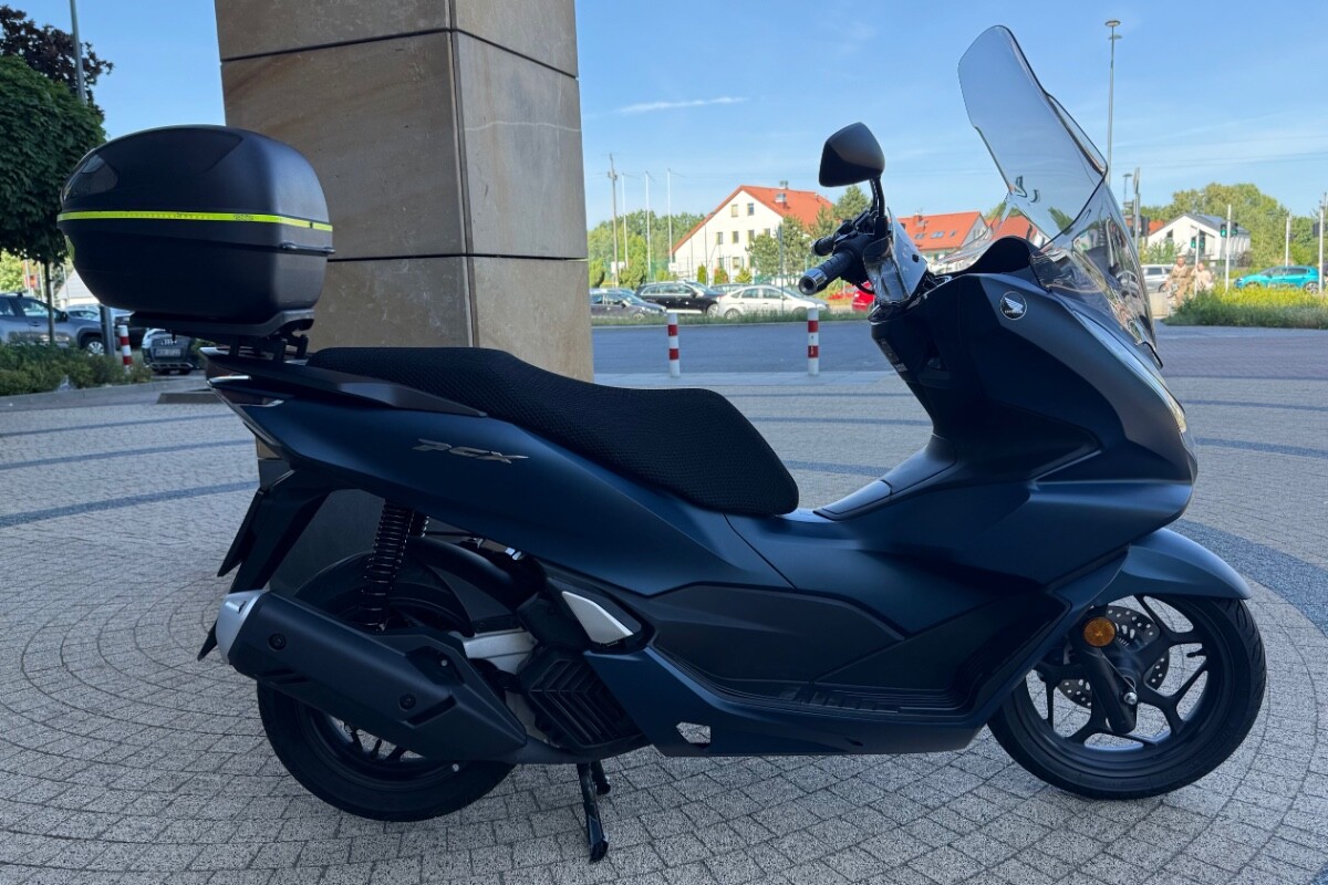 Skuter kupiony w warszawskim salonie Honda Wyszomirski pod koniec kwietnia 2024. Aktualny przebieg 2651 km. Kolor niebieski matowy. Do skutera dokładam turystyczną szybę PUIG, średniej wysokości szybę GIVI (nie widoczna na zdjęciach), deflektory dłoni, kufer z płytą montażową GIVI i przewiewny pokrowiec na kanapę. Na zdjęciach widnieje jeszcze uchwyt marki Quadlock, który nie jest stanowi oferty - już go zdemontowałem. PCX jest absolutnie bezwypadkowy, bez "paciakowy", bez zarysowań czy jakichkolwiek uszkodzeń. 100% sprawny. Skuter pali około 2 litrów na 100 km. Gwarancja fabryczna do końca kwietnia 2026. Serwis olejowy zrobiłem w okolicach 1000 km. Sprzedaję na pełną fakturę VAT - kupujący osoba fizyczna nie płaci 2% podatku PCC, a przedsiębiorcy mogą odliczyć VAT od zakupu. Ogłoszenie daję na razie tylko tu na forum, ale w marcu - kwietniu, jak się nie sprzeda wystawię na portalach branżowych. Cena za skuter z wyposażeniem 12.900 zł brutto. Zapraszam do kontaktu przez PM.